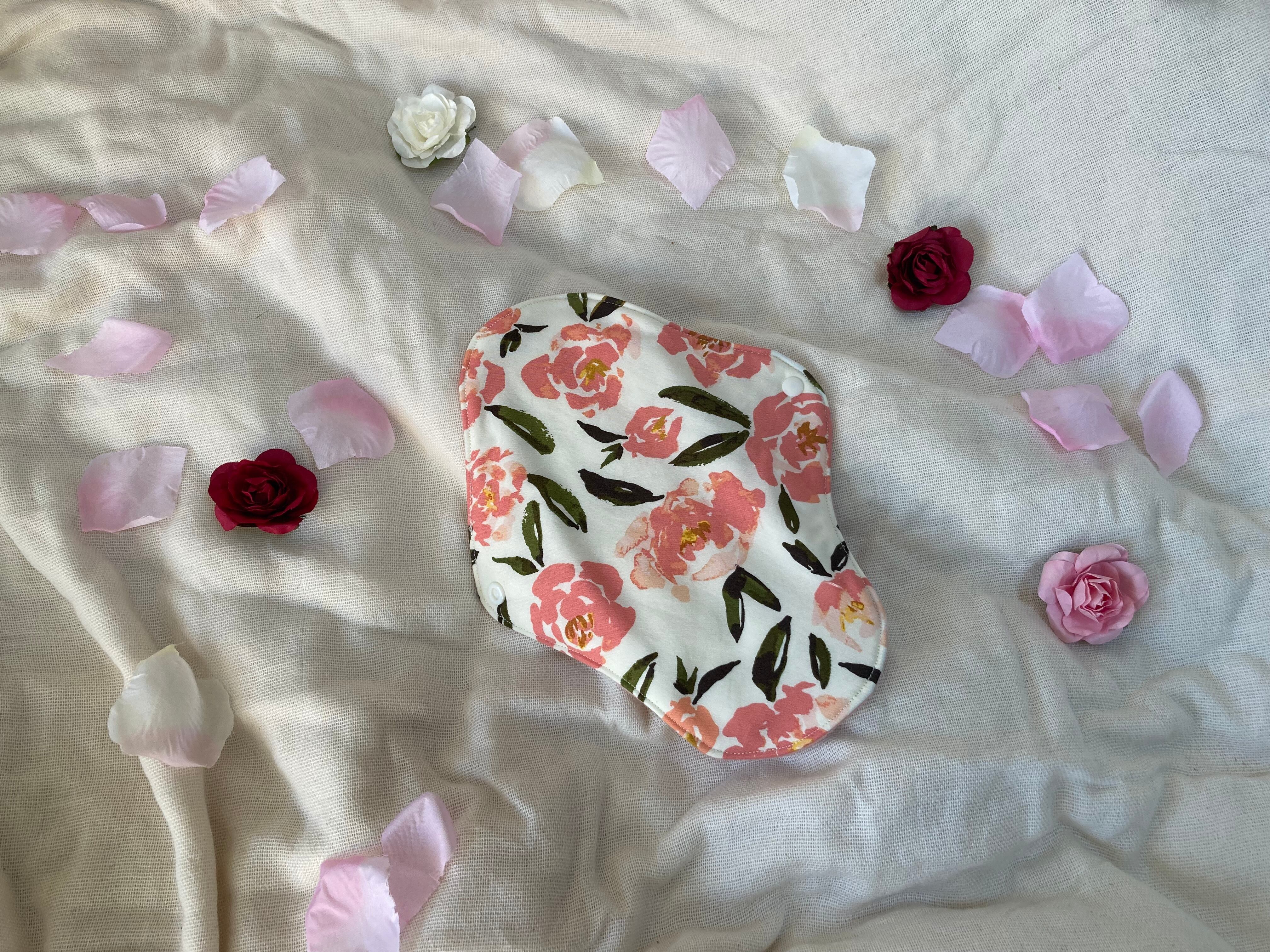 ベージュがかったオフホワイトにピンクで描かれた薔薇柄に、茜染めで柔らかなピンク色に染まったオーガニックのネル生地を合わせた布ナプキンMサイズ。