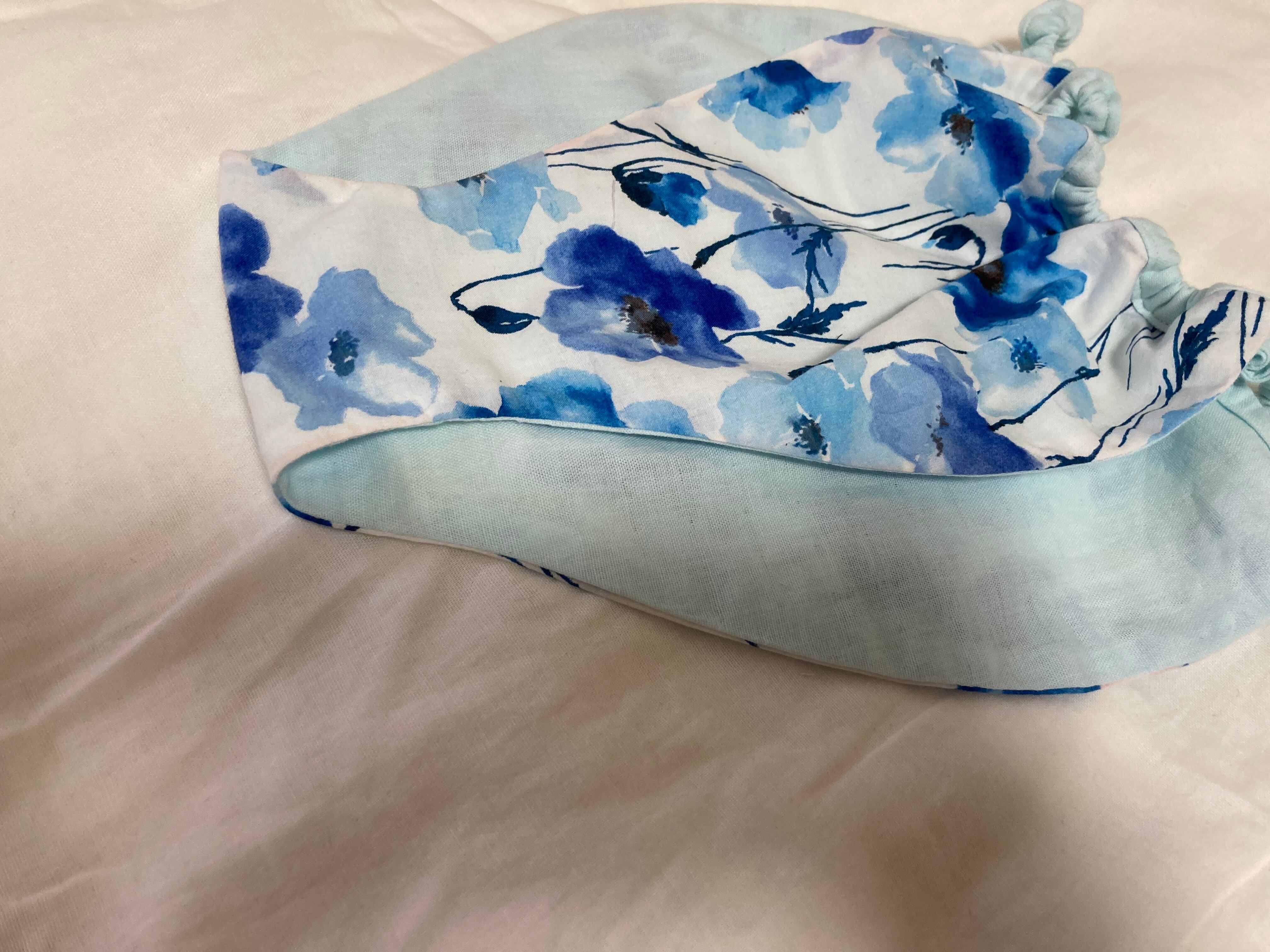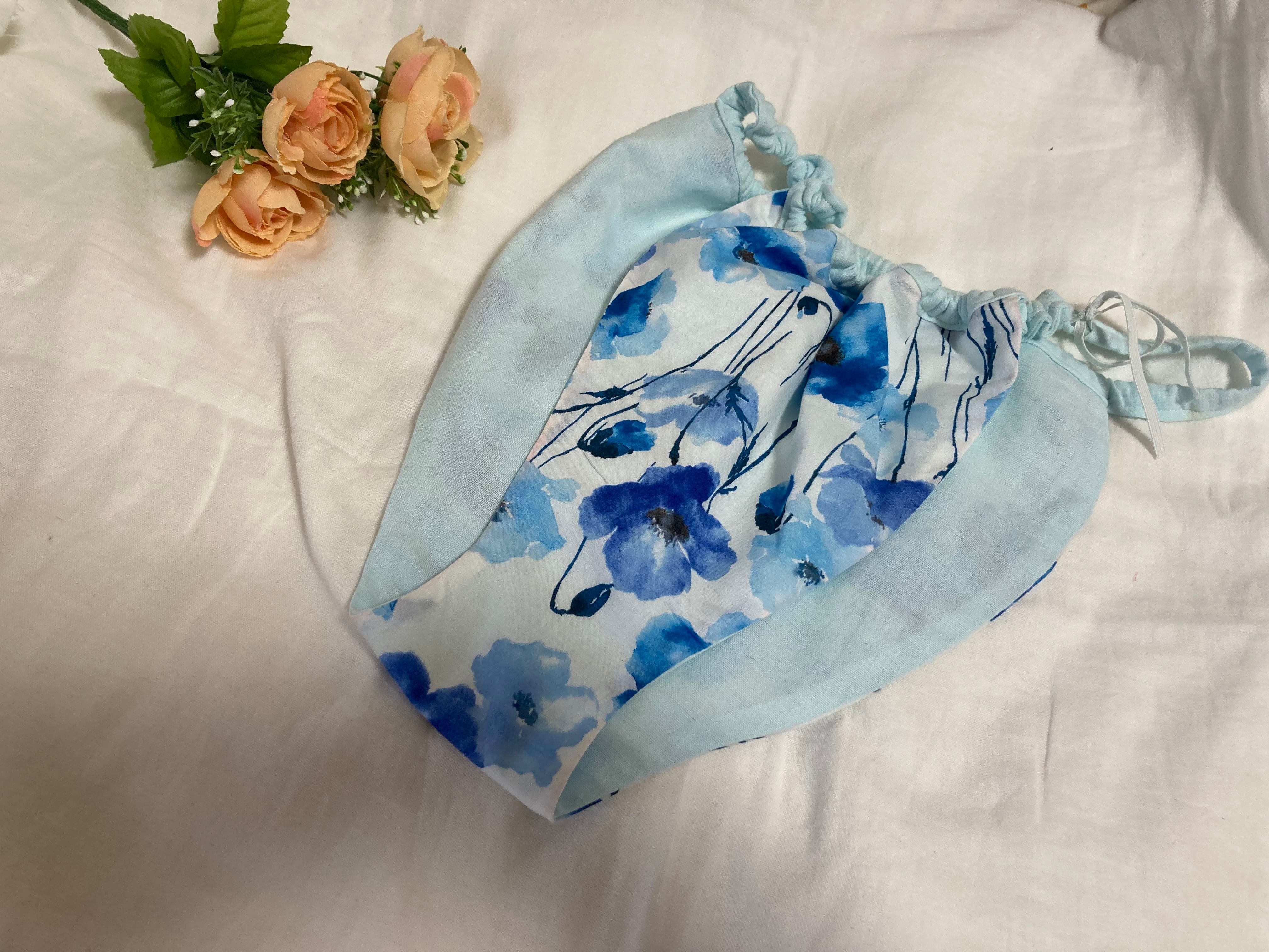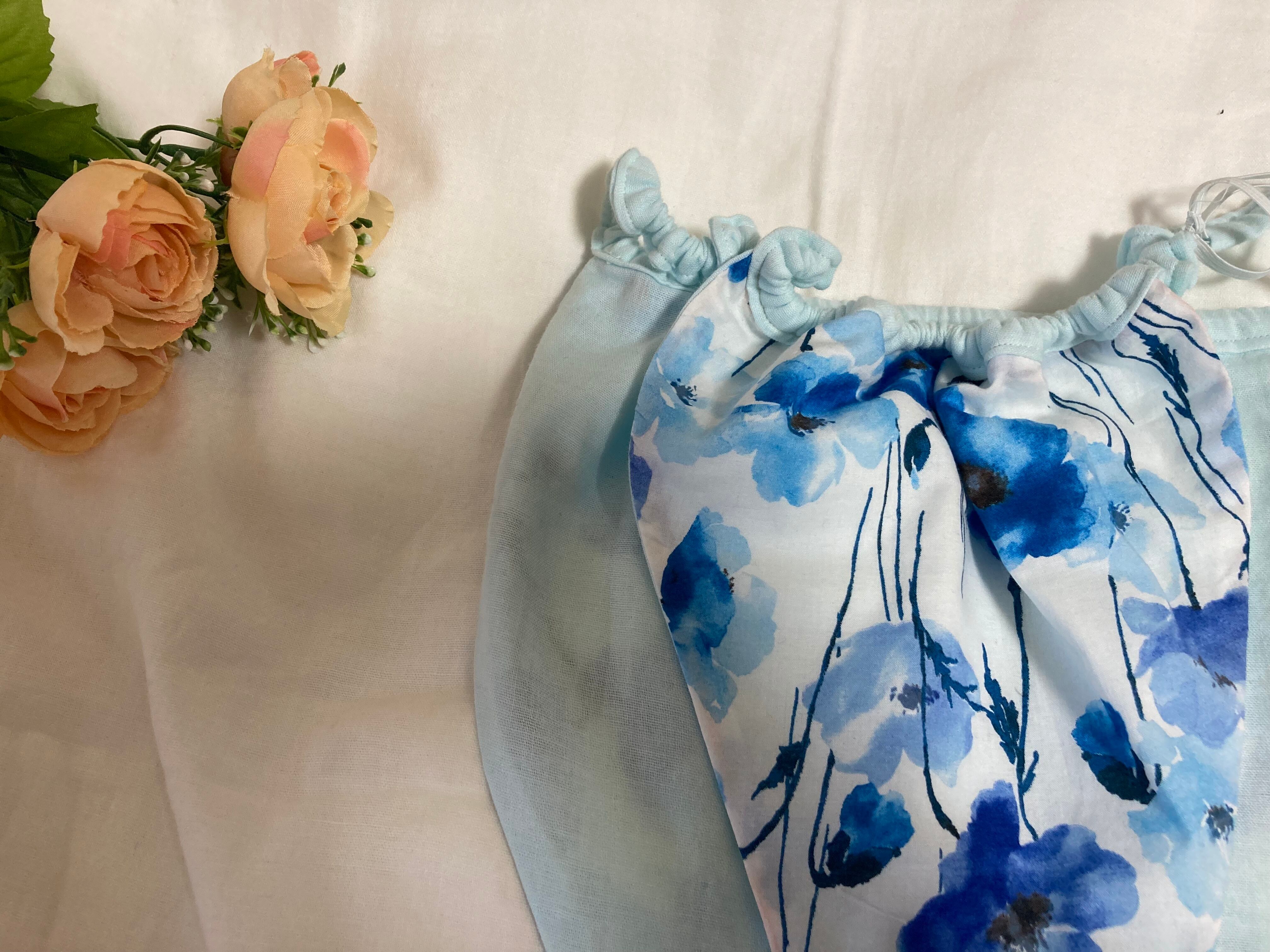 肌面とウエスト部分には、花柄にも使われている淡い水色を合わせ、華やかな印象の大ぶりの花柄を、爽やかで可愛いデザインに仕上げてみました。