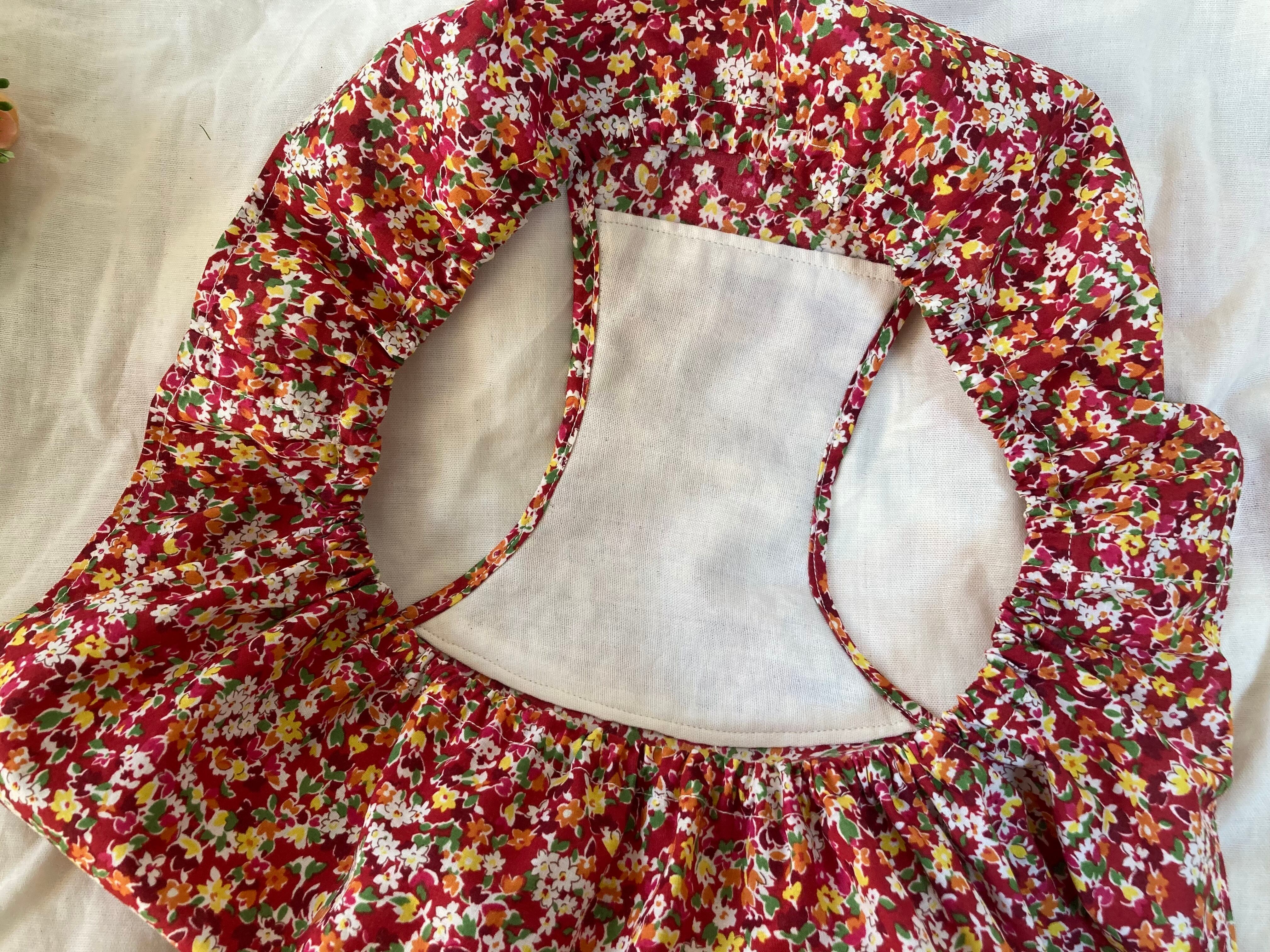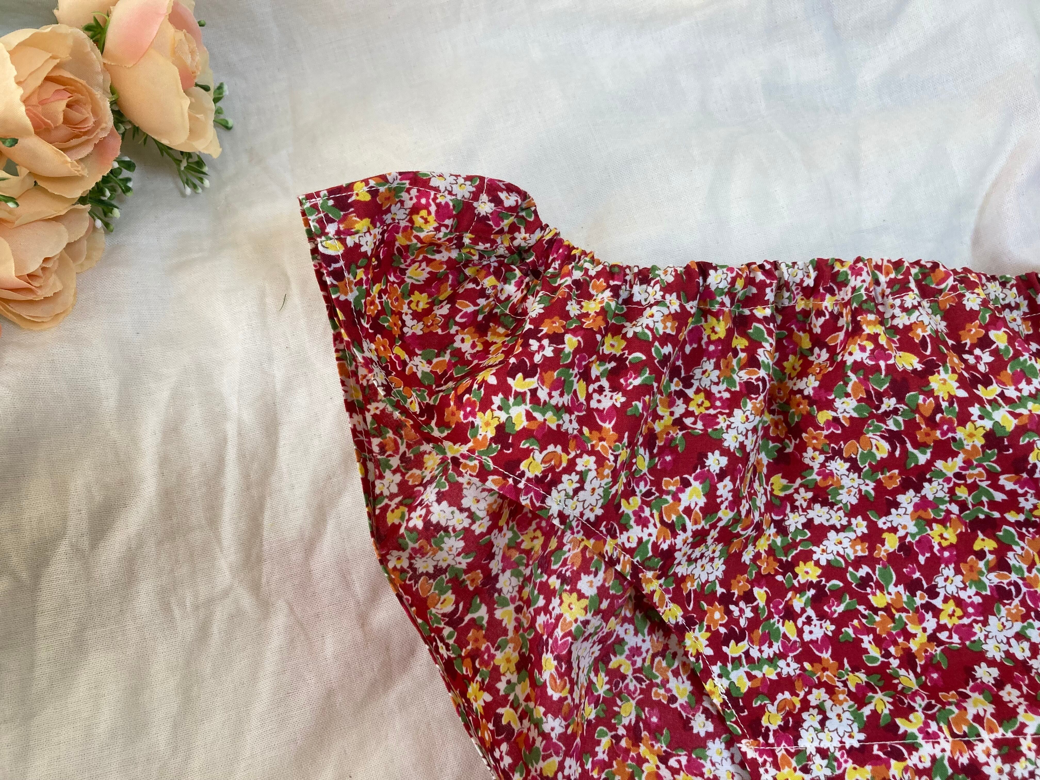 鮮やかで大胆な赤もふんわりとしたシルエット×小花柄で、ややフレンチテイストな大人可愛いデザインに。