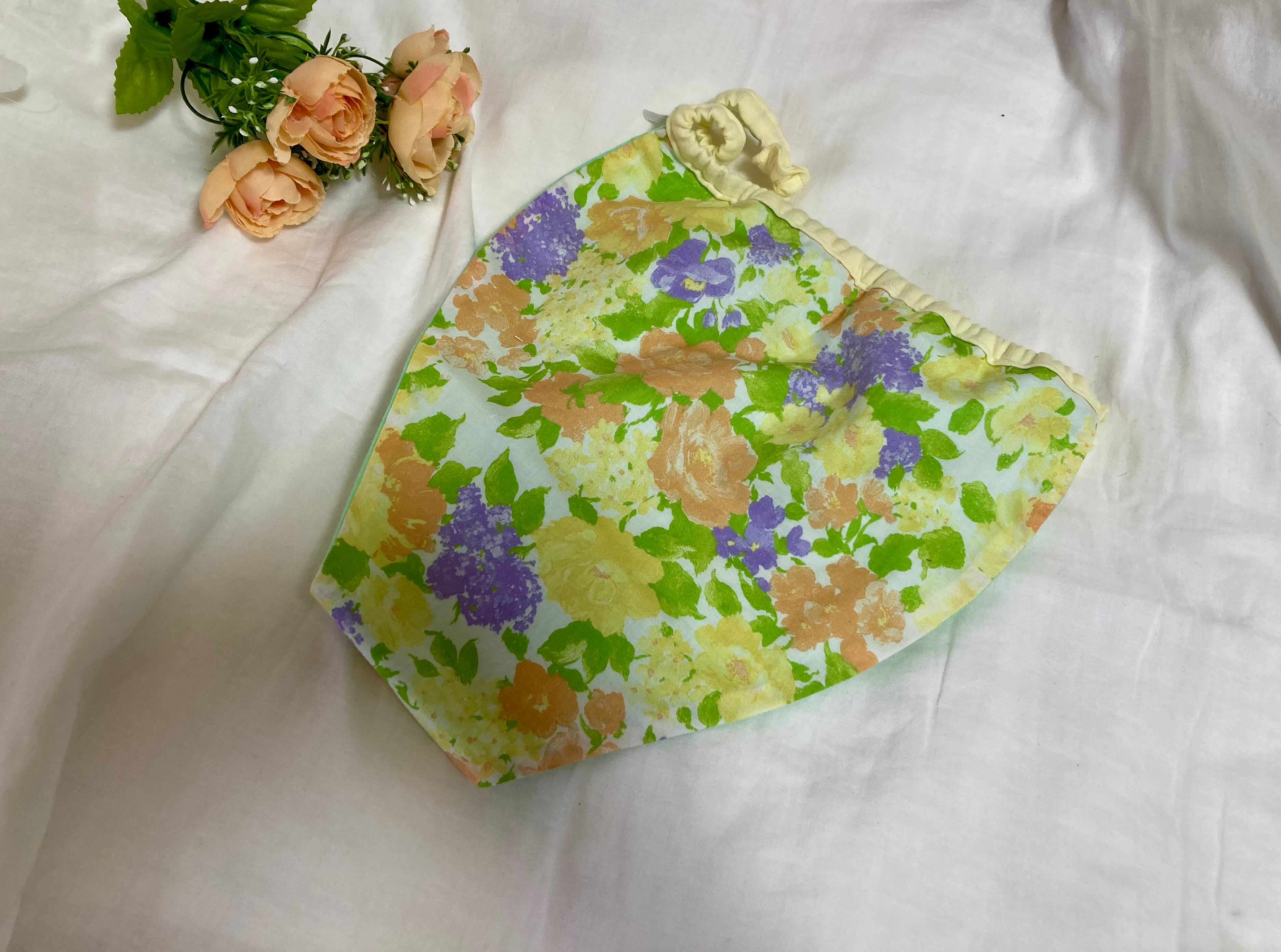 白地に水彩タッチでイエローとラベンダーの花柄が描かれた、華やかながらも爽やかさも感じられるデザインのふんどしパンツです。