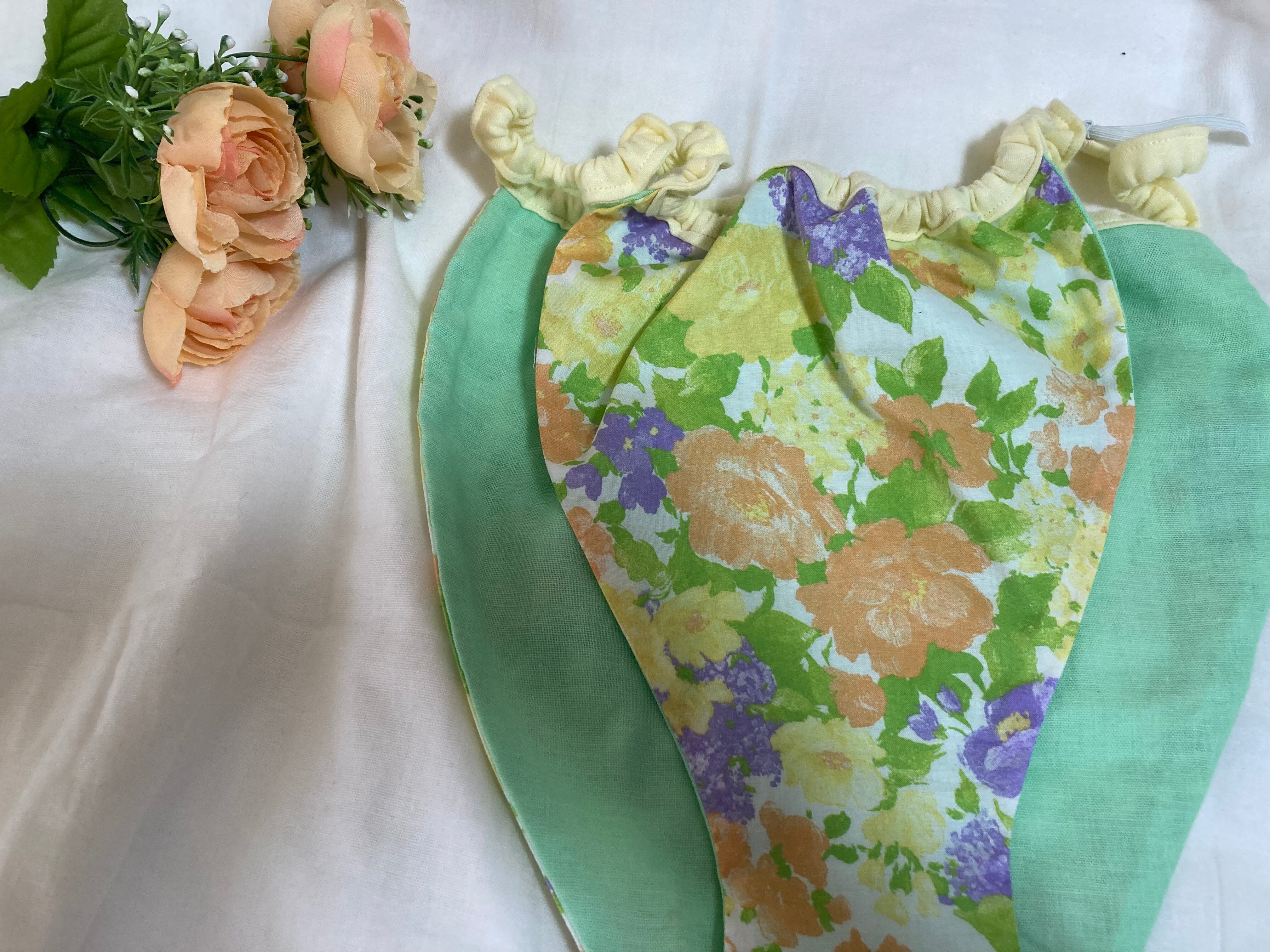 ウエスト部分には花柄の色味から1色とって、淡いクリームイエローを合わせ、まとまり感のあるデザインに仕上げました。