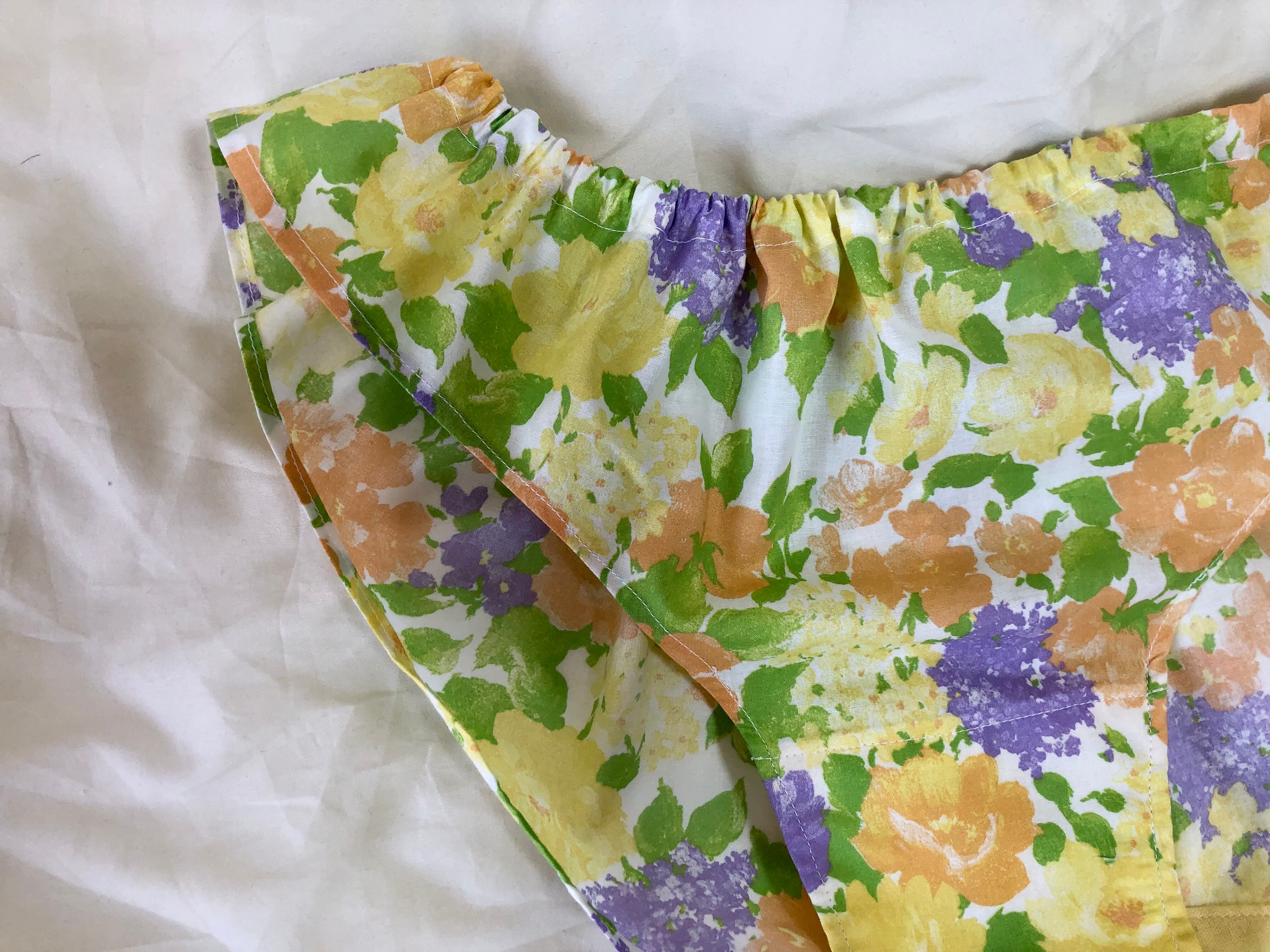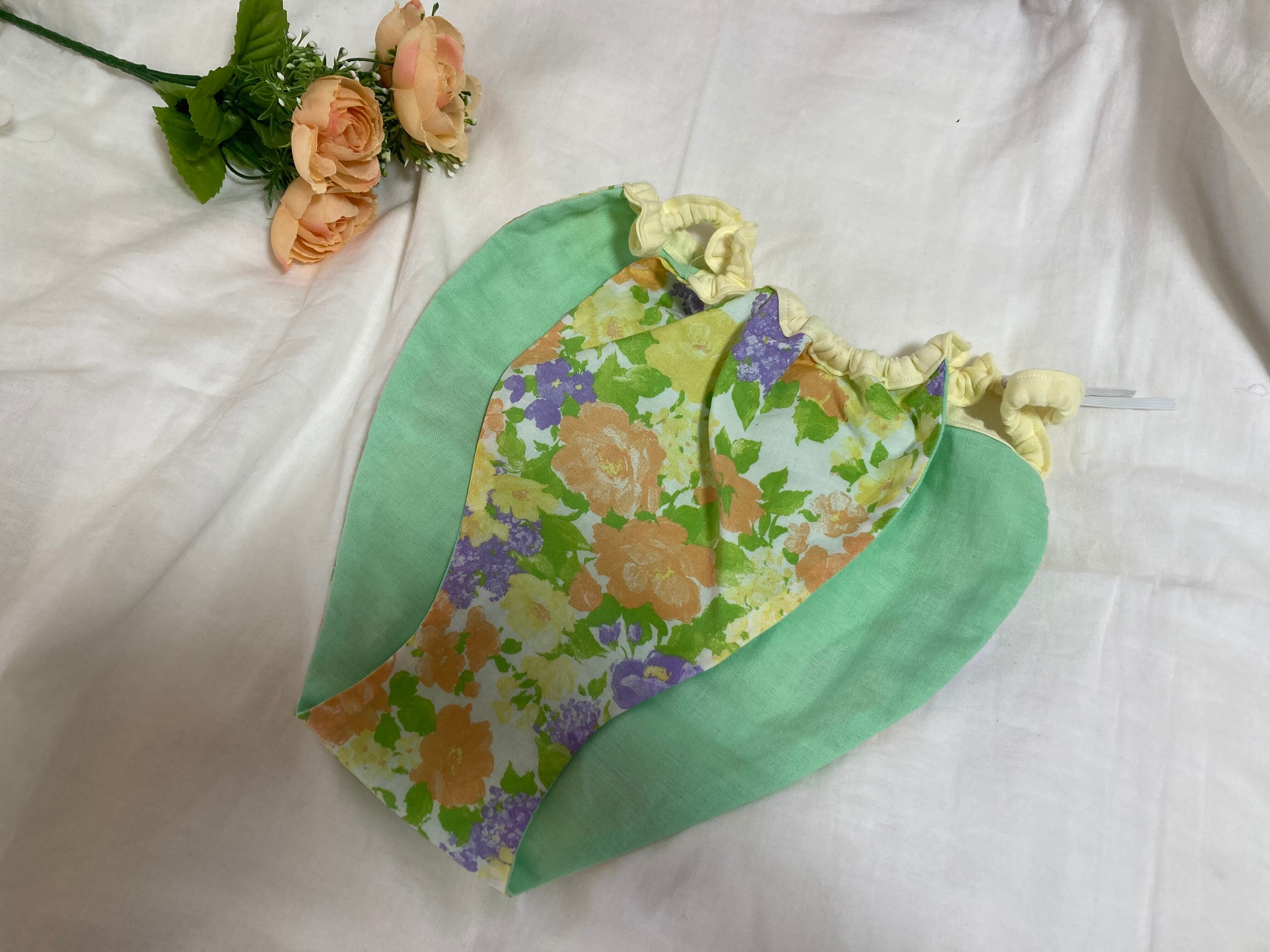 初夏から夏を連想させる白地に黄色とオレンジの花が描かれた爽やかなイエロー系デザインは、ライトグリーンのガーゼを合わせ、ひと匙の個性をプラス。