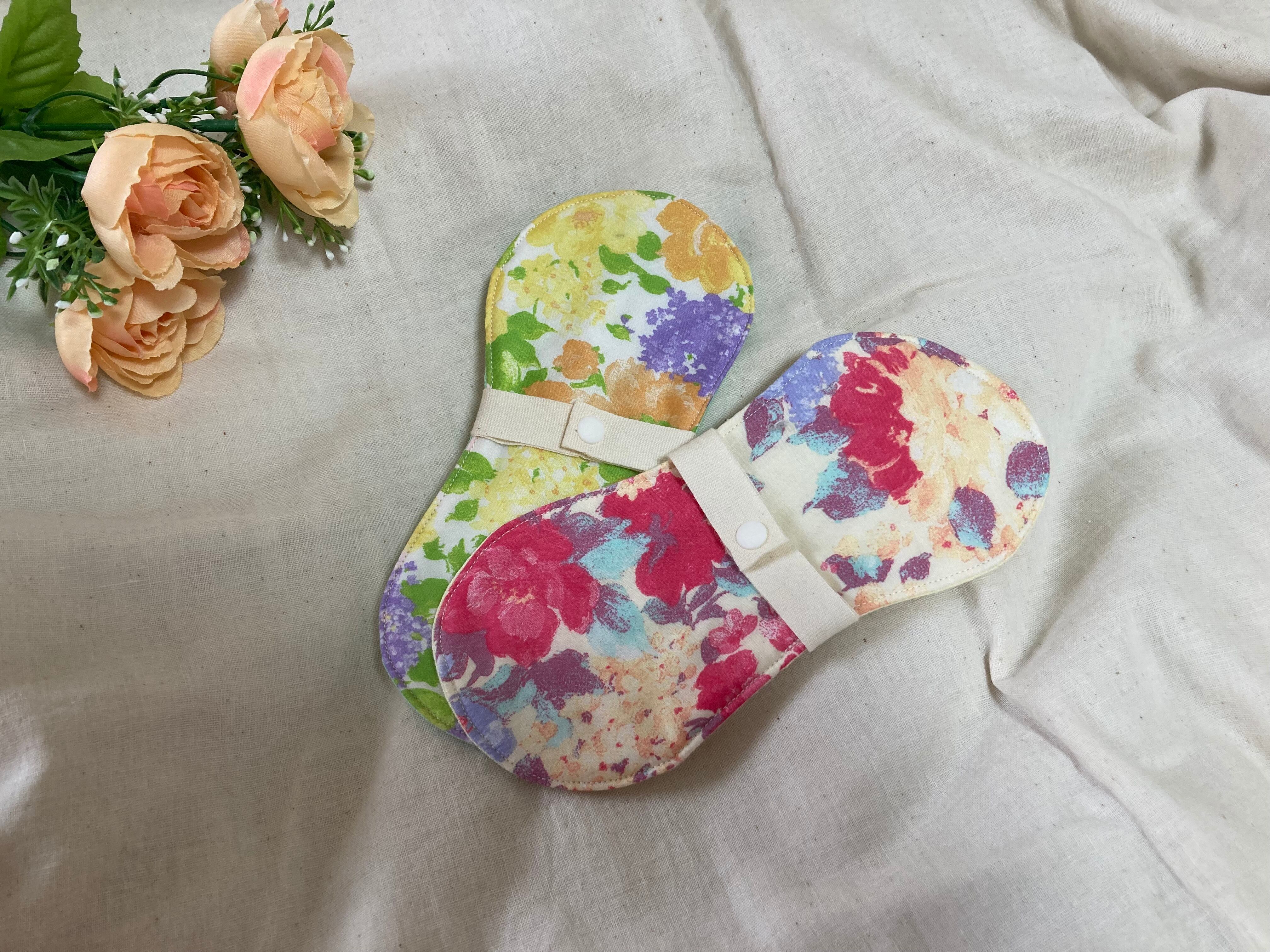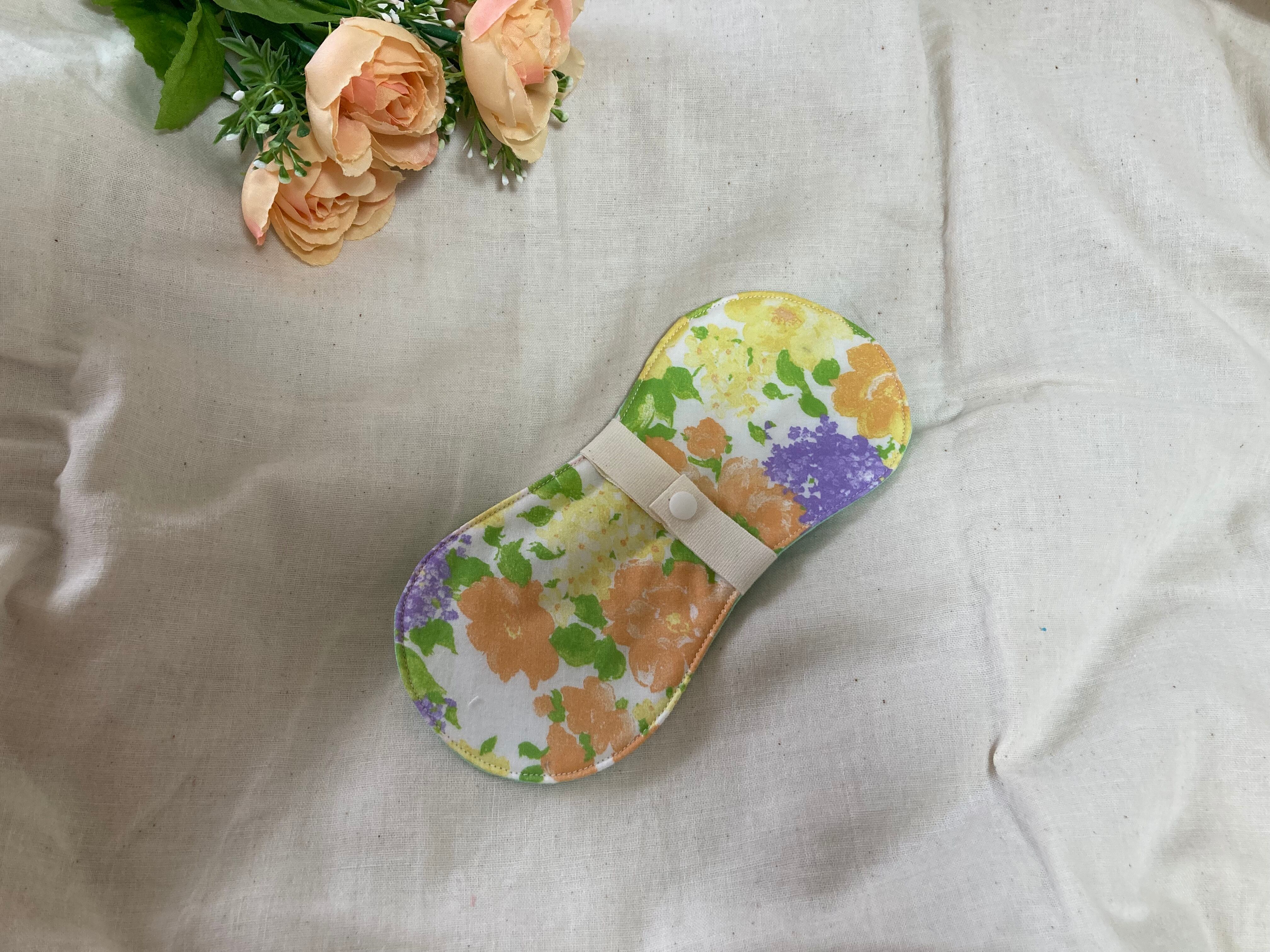 水彩タッチで描かれた花柄と、綺麗な色味のダブルガーゼを組み合わせた、華やかで美しいひょうたん型のスリムな布ライナーです。