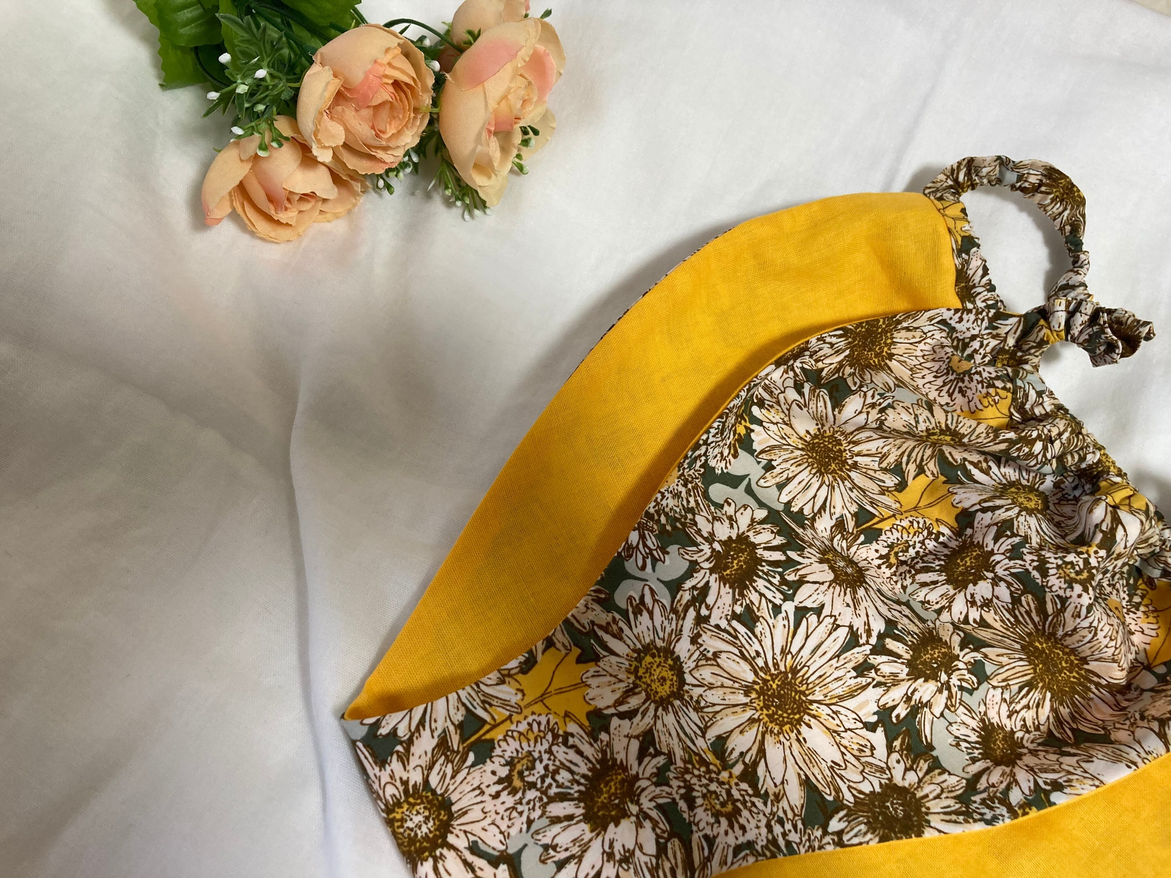 肌面には柄に使われているマスタードがかった黄色と合わせて、大胆なビビッドイエローのダブルガーゼを組み合わせ、個性的な1枚に。