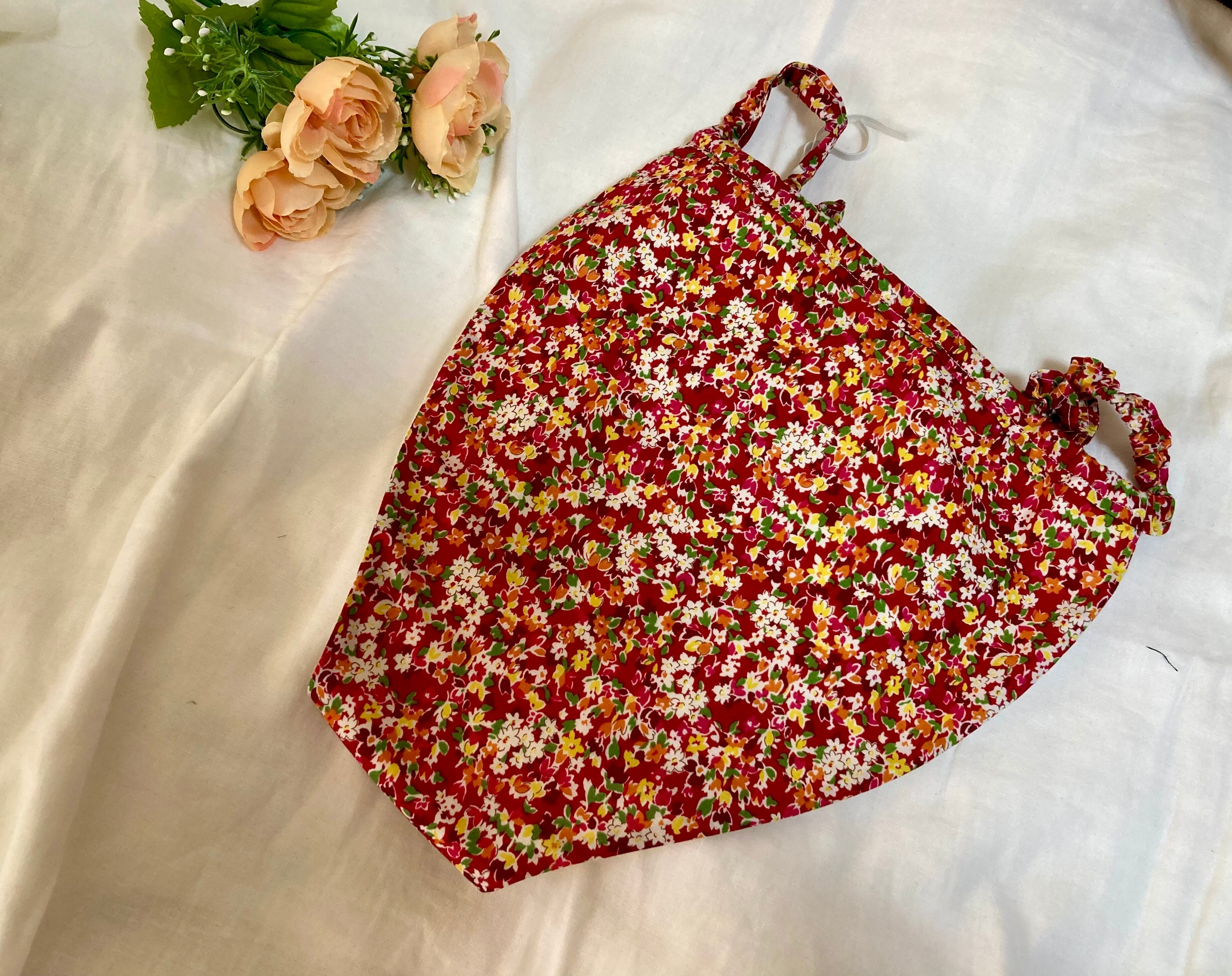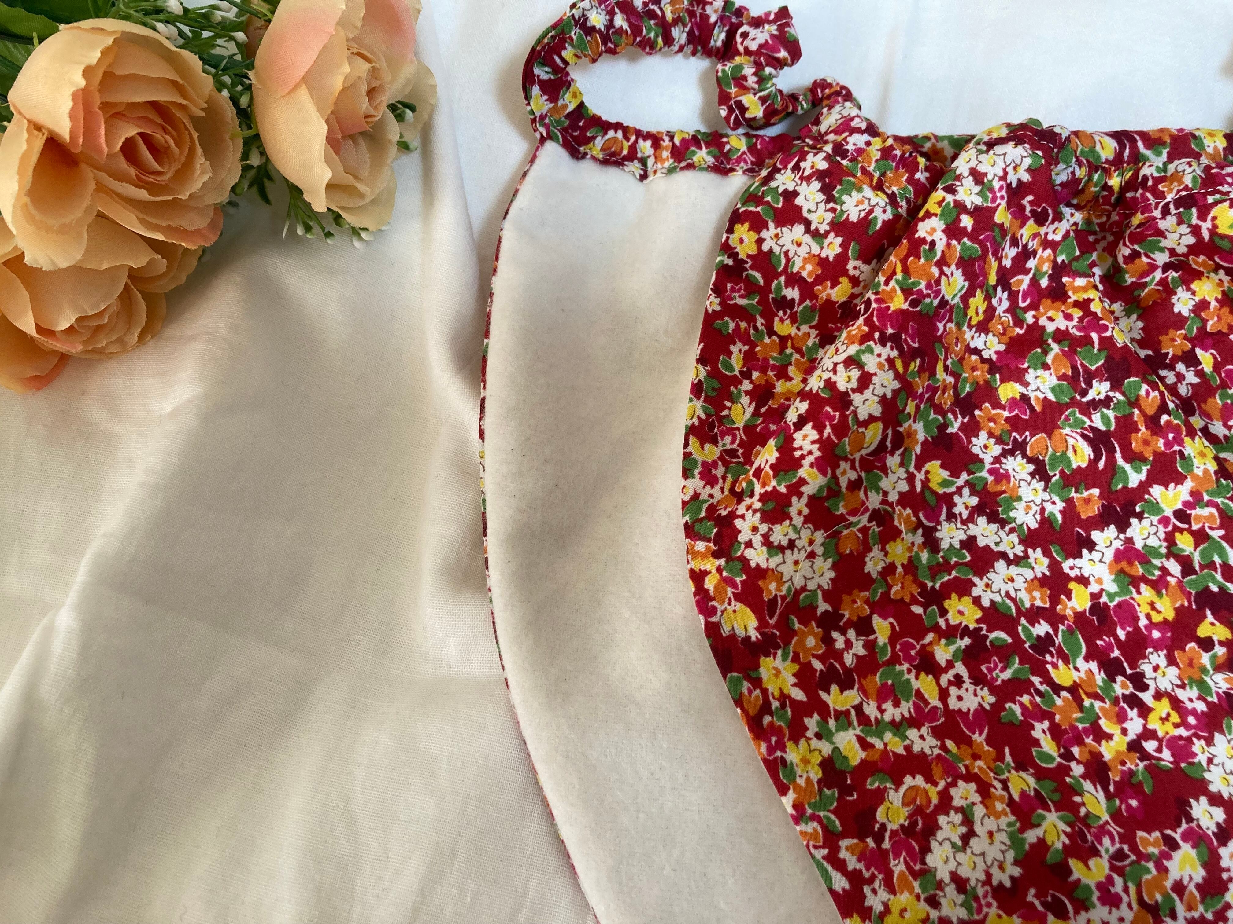 生きる情熱や活力を与えてくれるエネルギッシュで大胆な赤の小花柄を、ナチュラル感たっぷりな生成りのオーガニックコットンダブルガーゼと組み合わせ、ややクラシカルなフレンチキュートなデザインに仕上げました。