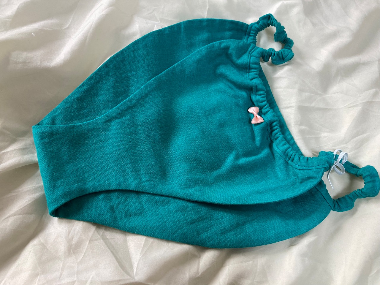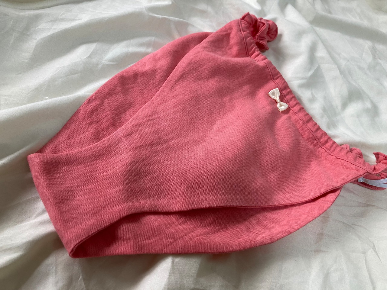 サーモンピンクは生地の色味の可愛さを引き立たせるよう、控えめなクリームかがったオフホワイトのリボンを。