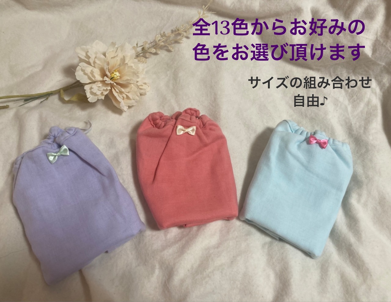 お好みのお色・サイズ・フロント部分のリボンの有無をお選び頂けます。
