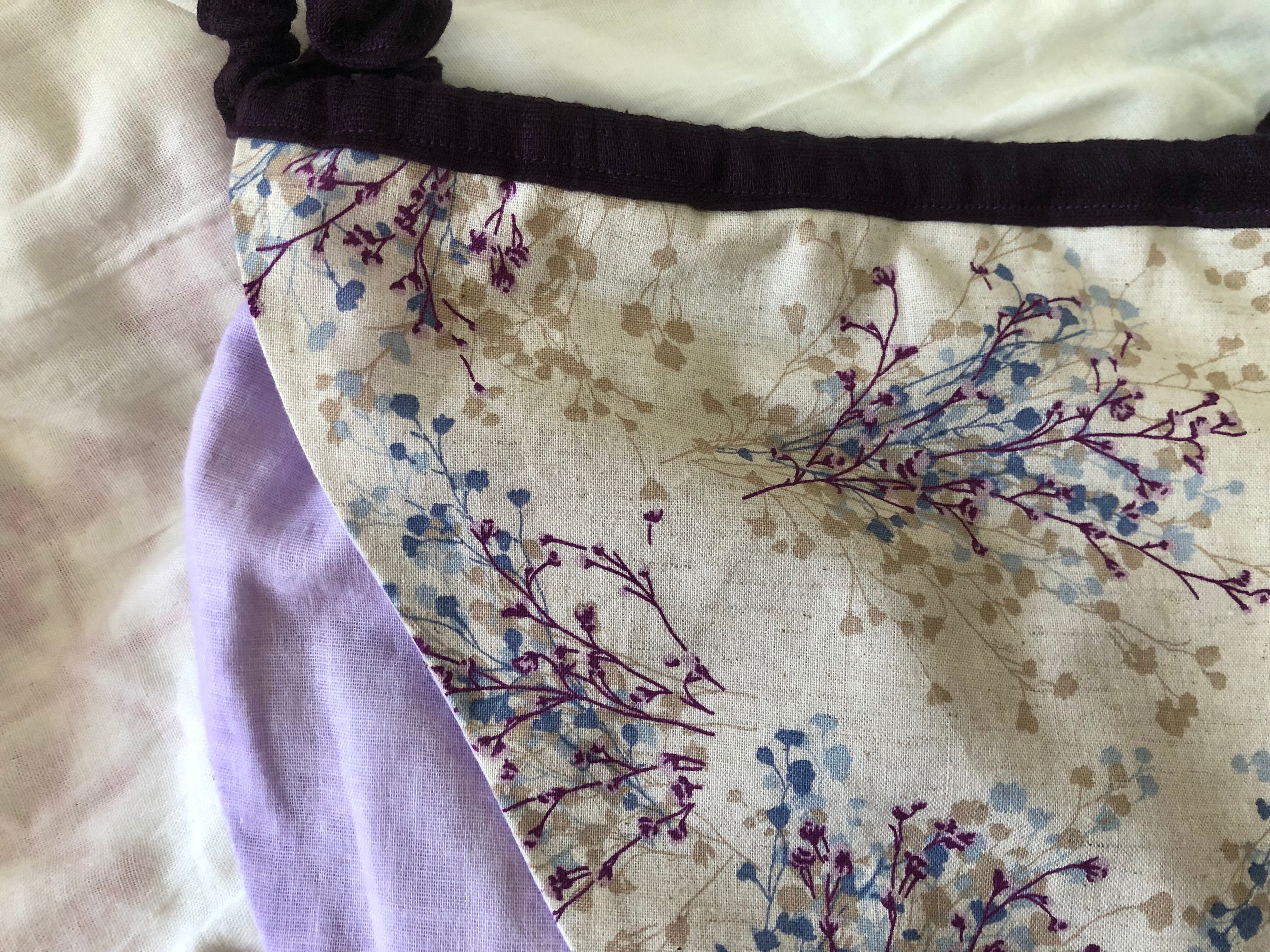 柄面の生地は綿麻、ウエスト部分はリネンでナチュラルな印象ですが、柄に使われている紫・ラベンダーを合わせ、大人のほのかな色気を感じさせるデザインに。
