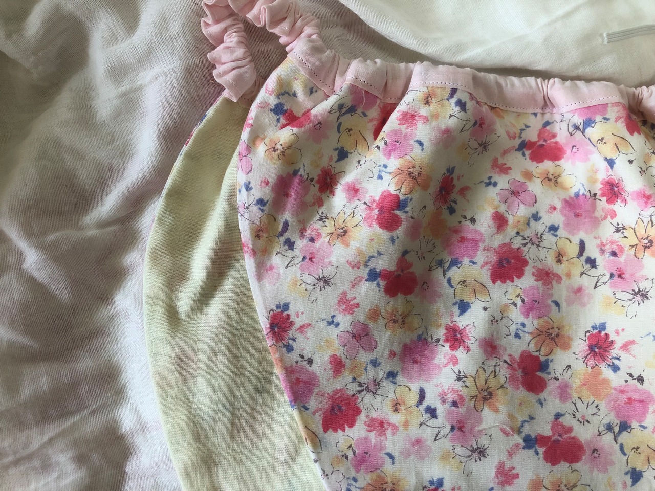 優しいクリームイエローのダブルガーゼに、ウエスト部分には柔らかなピンクの綿ローンを合わせ、可愛らしくも清楚な爽やかさも感じられるデザインに。