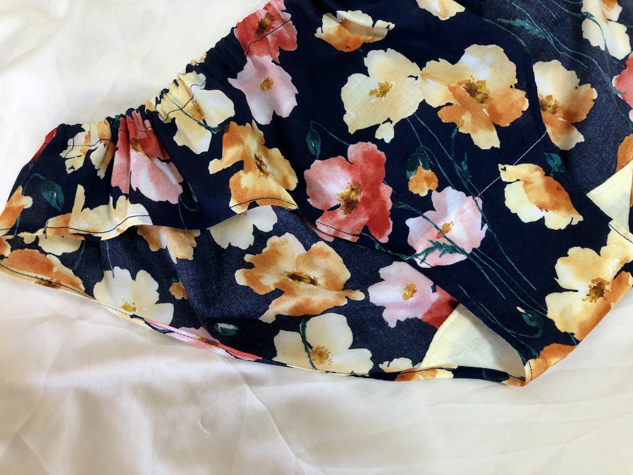 ネイビーにピンクとイエローの花柄で、どことなく清楚かつ大人可愛いデザインに。