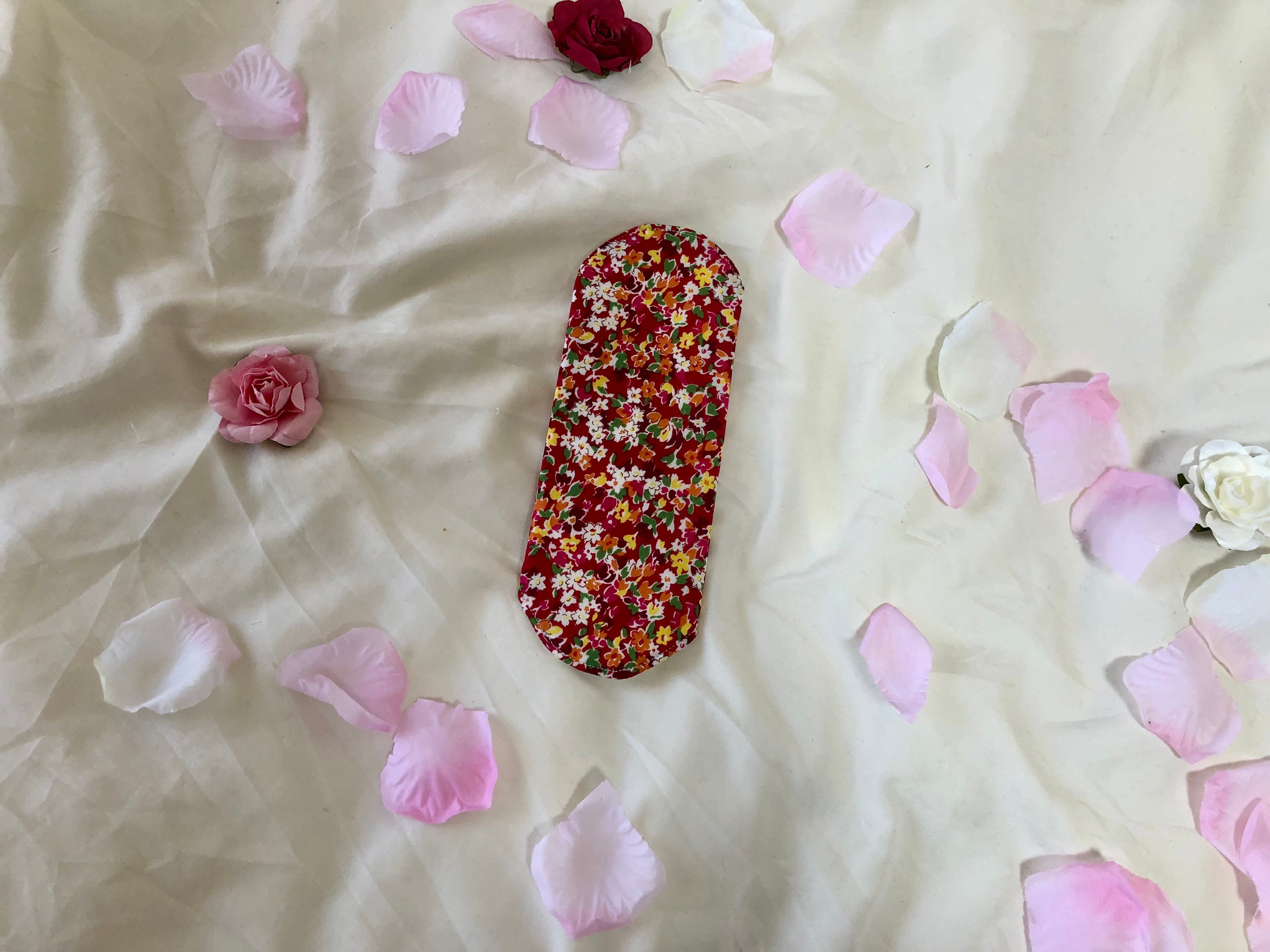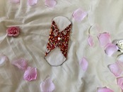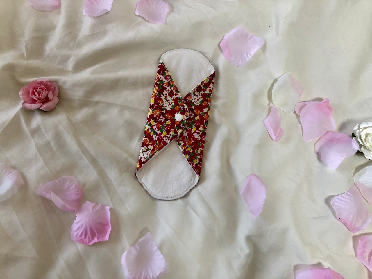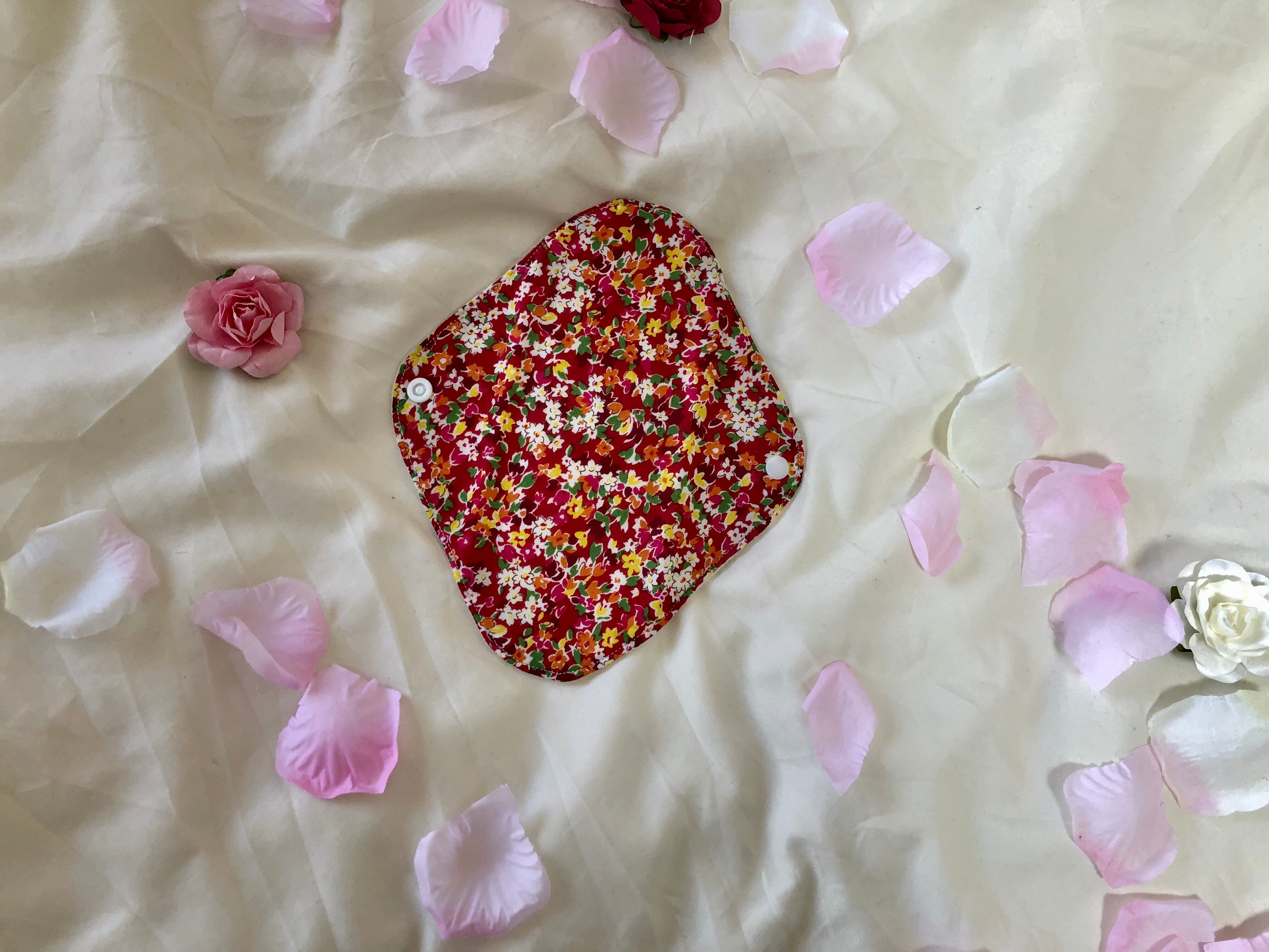 鮮やかな赤の小花柄が印象的な防水布なし3層構造の布ライナーです。