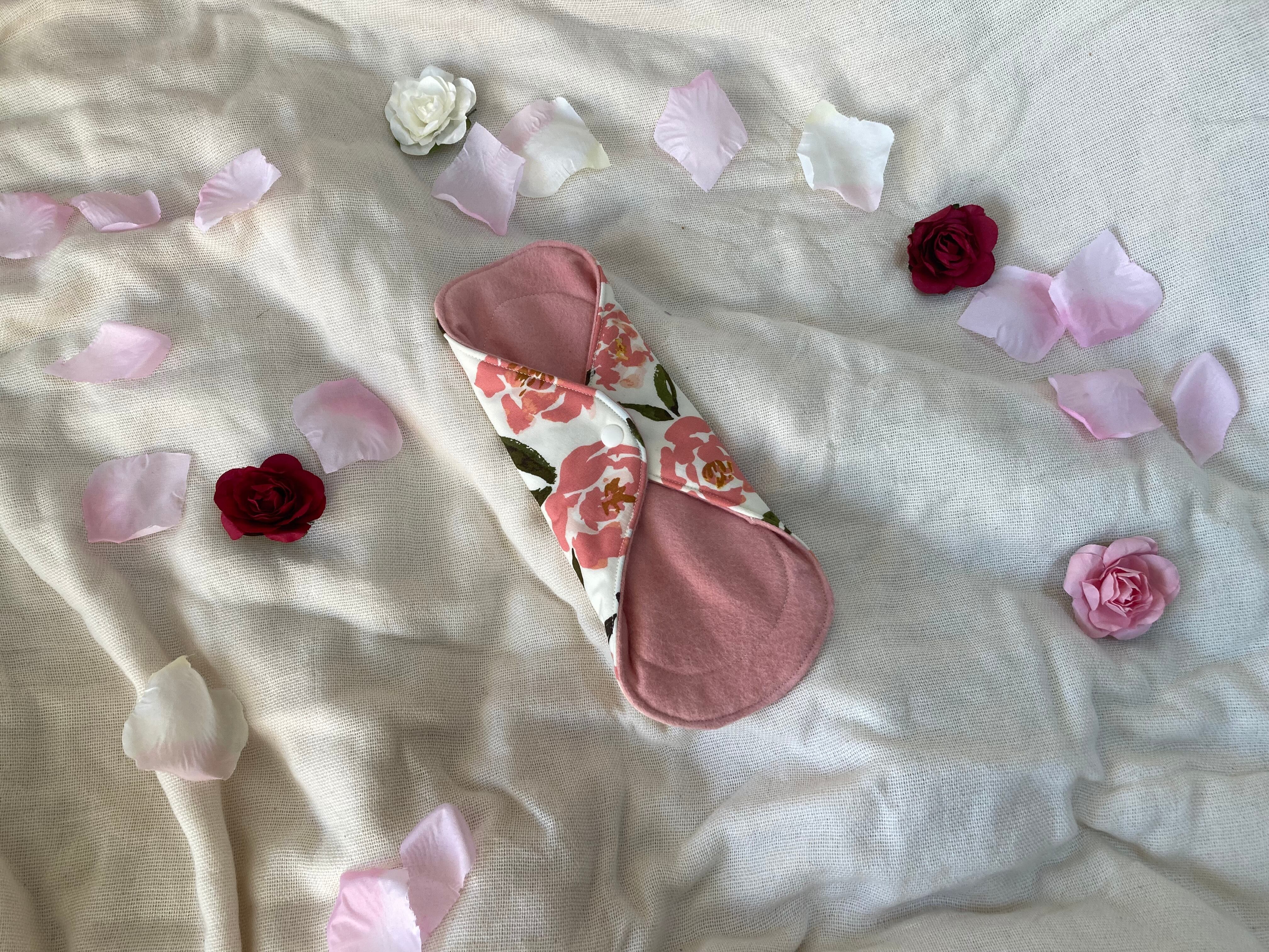 ベージュがかったオフホワイトにピンクで描かれた薔薇柄に、茜染めで柔らかなピンク色に染まったオーガニックのネル生地を合わせた布ナプキンMサイズ。